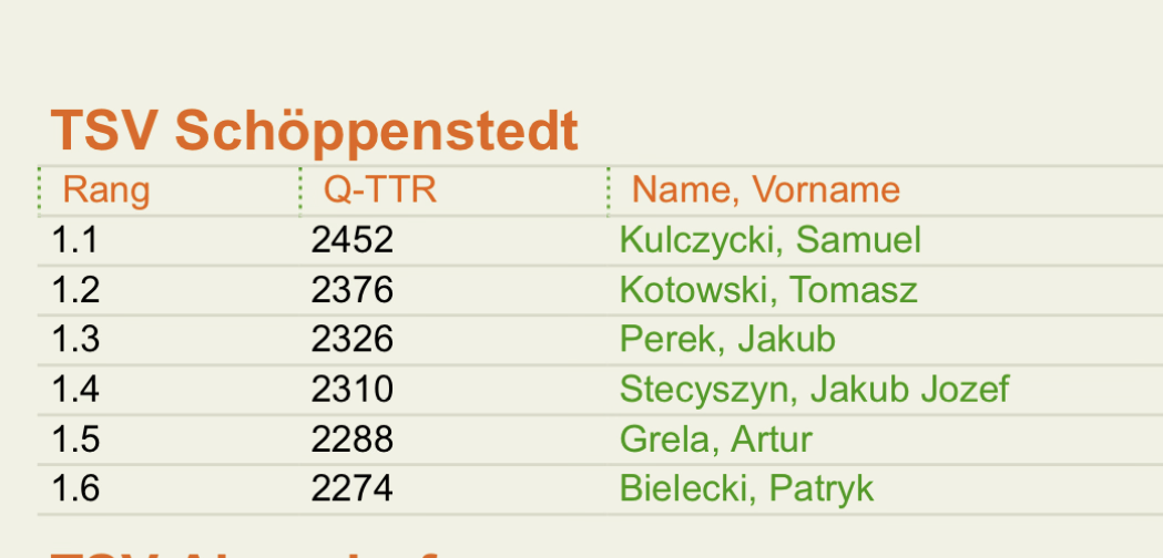 Leider kommt nicht die Nummer 1 Samuel Kulczycki, der bereits Duelle mit Boll oder Franziska ausgeglichen gestalten konnte. Wahnsinn wäre, wenn Stecyzyn als 3er (1.4) mitreisen würde, dann würde „hinten“ jemand mit 2310 Punkten spielen :-).